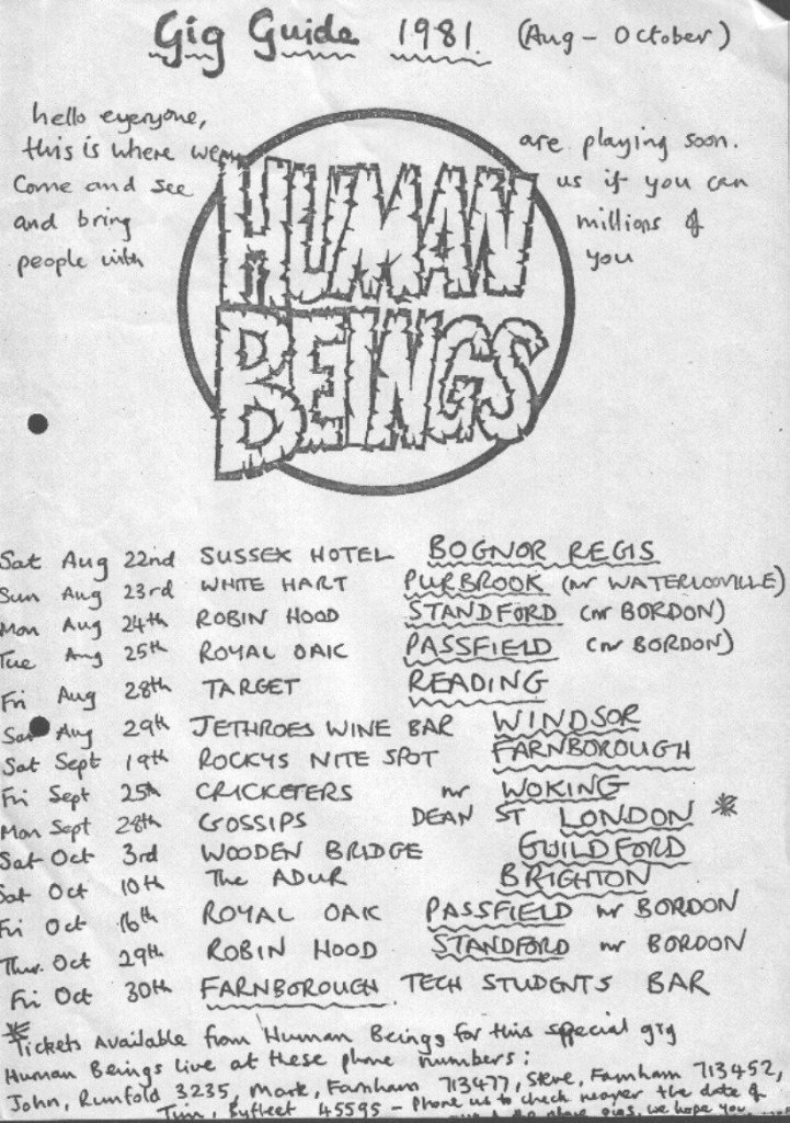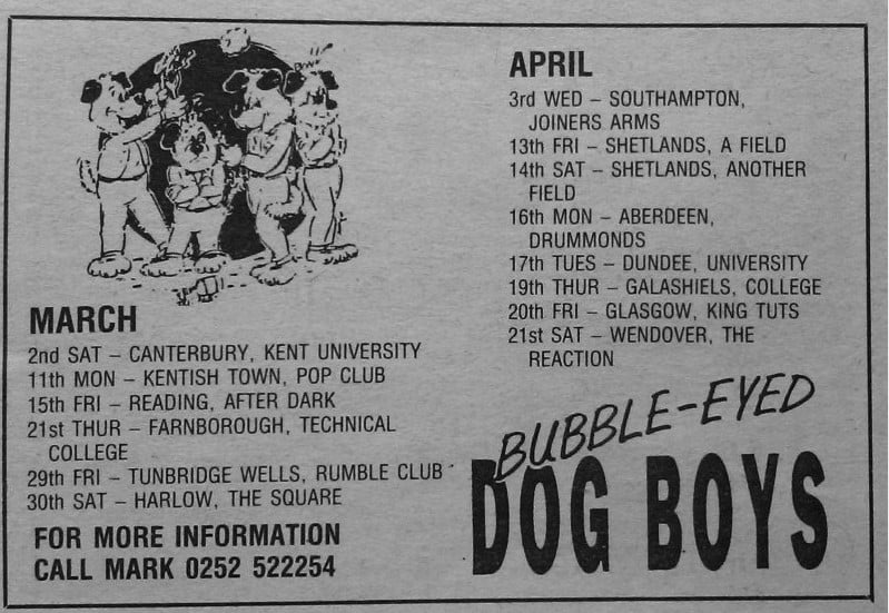 The college’s first gig of ’80 was held on 19 January and featured synth-pop band Landscape, who’d be better known the following year after releasing Einstein a Go-Go and Norman Bates. Two local bands rolled onto campus on 18 April ’80: The Torpedoes and The Vulgar Bros. Farnborough Tech’s Rugby Union Football Club hosted Lethal Dose, along with headliner Deadlock, on 14 November ’80, after the cancellation of a gig at the venue on 31 October due to licensing issues. Then on 13 December ’80: John Otway and Wild Willy Barratt, with Eddie Stanton played Farnborough Tech. By the early 80’s gigs by progressive rockers, such as The Enid, were few and far between and punk was appearing with the likes of Aldershot’s Human Beings taking the stage on 27 March ’81 with Deadlock in support. Pozer, without guitarist Paul Sheldrick due to a horrendous car accident, played as a four piece at Farnborough Tech in ’81. In the words of fellow guitarist and band member Rob Kemp, “It was awful”. Human Beings returned, on 30 October ’81, seven months after their first appearance; and another local band to appear at the college in this time frame were Cutting Edge, there on 29 January ’82. The next week Cuban Heels were accompanied by Studio 45, on 6 February. Black Easter played on 17 December ’82, apologizing for the high admission fee (£2.00) and ban on boots via their flyers. Squeals of Delight were supported by West One and Safety in Numbers on 6 December ’85; and when Controls played the college later that month they recorded the gig and released the live recording under the title “Let’s All Bark Like Labradors” on Stupid Rabbit Tapes in ’86. West One came back to college on 15 March 1986; Jim Jiminee couldn’t ‘Do It on Thursday’, performing on 25 February ’87 in the Student Union Bar, and Magic Moments At Twilight Time performed their set in ’88 at the SU Bar.