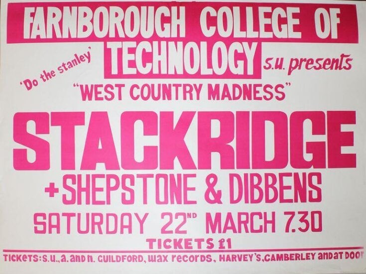Two weeks later, on 25 November ’72, the melodic, hook-laden hard rock of Stray was supported by Magic Muscle’s psychedelic / space rock – what we wonder is how the SU got along with Stray’s manager, Charlie Kray? Quo were due to return on 15 December ’72, with support provided by Snake Eye. The Francis Rossi and Bob Young written single “Paper Plane” had been released on 10 November and reached No.8 in the UK Singles Chart. The bands management decided to pull them out of the gig and elected to play the Guildford Civic Hall in March ’73. On 16 December 1972, the Stackridge “Treasure Island” Tour came to the college with The Pigsty Hill Light Orchestra supporting. The Wild Horses, Supercharge, Radio Stars, Moonraker, and Little Acre also appeared at the college. Around this time Ken Dudley, who would later open The Rock Box, Camberley; broke into the music industry thanks to a meeting at Farnborough Tech with a promoter who asked him to undertake some flyposting.