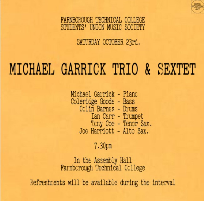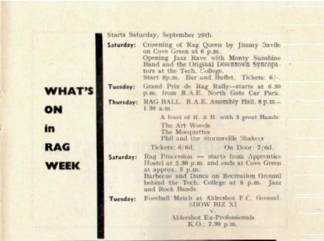 Jazz was back at the Tech when the Michael Garrick Trio and Sextet performed in the Assembly Hall on 23 October ’65. This was recorded and later released as “Farnborough Technical College 1965 (feat. Joe Harriott, Ian Carr & Tony Coe)” on 25 February 2022, having been pulled from a private collection of recordings. The Nashville Teens were supported by The Cops and Robbers and Liverpool’s The Clayton Squares on 1 April ’66 and on 2 July ’66 the Graham Bond Organisation appeared at the College, with The Sands in support, but Jon Hiseman replaced Ginger Baker for the show. On 22 April ’67, Moon’s Train rolled in to entertain the students, returning on 15 December ’67 and 25 May ’68. R&B group The Flirtations, who had supported Tom Jones on his European tour in ’68, also appeared in the late 60’s. On 16 November ’68, The Ferris Wheel were supported by The Gods, who were touring the debut LP titled ‘Genesis’. As with many gig holding educational establishments, it wasn’t just the bands appearing that might go on to fame and fortune in the music industry, but also some of the inmates. In ’68 a young Alan Clayson, who edited the student mag and contributed three articles to the ‘Schoolkids’ edition of Oz while there, started at Farnborough Tech. He is better known by many as the figurehead of Clayson and the Argonauts, a band that crashed the bill of a pre-punk gig at the Civic Hall, Guildford and received a very positive review in NME. The Chronic rag mag for Farnborough Tech and RAE Apprentices’ Rag Week 1969 lists a number of balls with live bands over the Autumn semester, but only one – the Funny Ball – was at the college on 4 October 1969 featuring jazz from Bob Kerr and his Whoopee Band and Sam Spoon’s Bumper Puzzle Band Kit, you may recall Spoon – aka Martin Ash – as the percussionist of the Bonzo Dog Doo-Dah Band. Other events were held at the R.A.E. Hall, Farnborough.