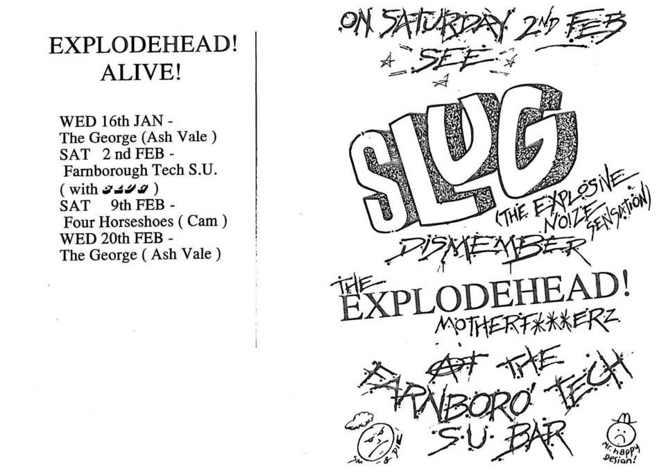 We have a very fragmented record for the ’90s, although our contributors recall going to gigs on the regular at Farnborough Tech. The mad pop, ska, punk, folk guitar thrash out of Who Moved The Ground? and Bubble-Eyed Dog Boys came to college on 8 November ’90. The heavier tunes of Explodehead and Slug undertook an ‘Official Rob Night’ on 2 February ’91, and five days on Who Moved The Ground? returned to performed with The Becketts. The following month Bubble-Eyed Dog Boys played the Tech again, as part of their ‘1991 Tour’, on 21 March ’91. Blue Velvet and Pretty Green showed the audience how they did it on 18 April ’91. P.J. Harvey was there on 26 September ’91.