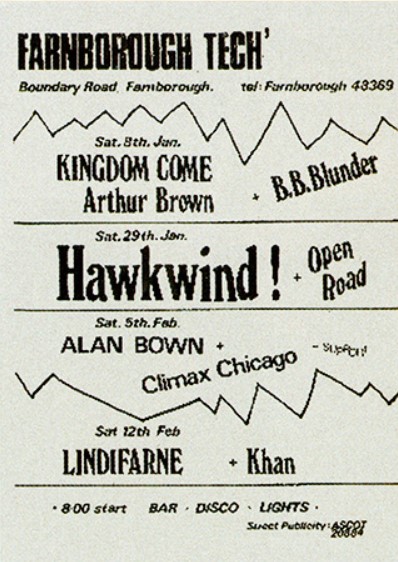 Thanks to an active student union, Farnborough Tech, as it is colloquially clept, held many memorable gigs over the years…particularly in the ’70s.