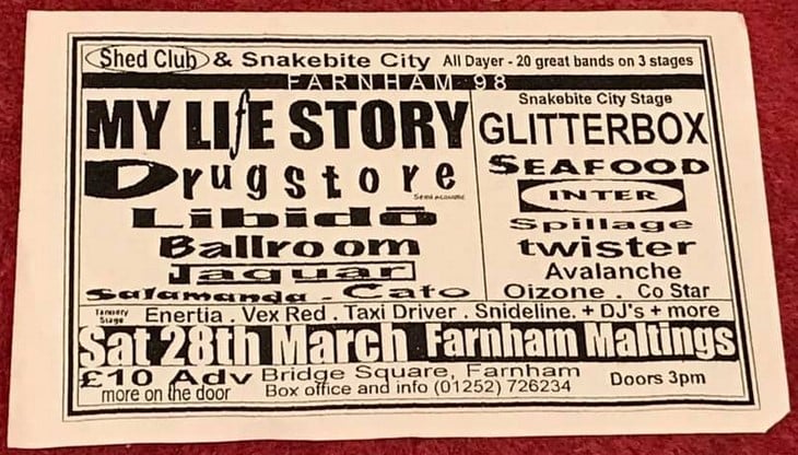 The Maltings, Farnham hosted Farnham ’98, on 28 March ’98, and Snide Line joined Enertia, Vex Red, and Taxi Driver on the third.
