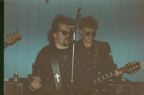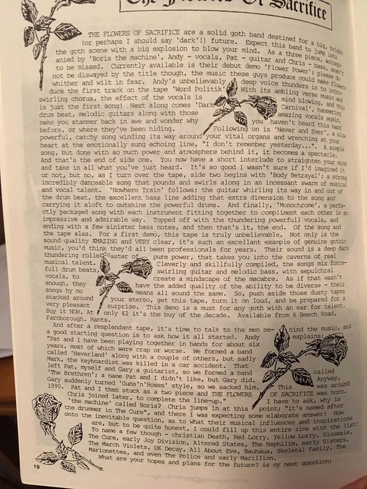 Clark and Evans were in Neverland with Gary Henderson (guitar) and Mark Hopgood (keyboards). Following Hopgood’s death in a car accident the remaining three formed The Brethren. A difference in musical direction led to Henderson leaving in ’88 and the formation of Farnborough based 2-piece Goth band The Flowers of Sacrifice.