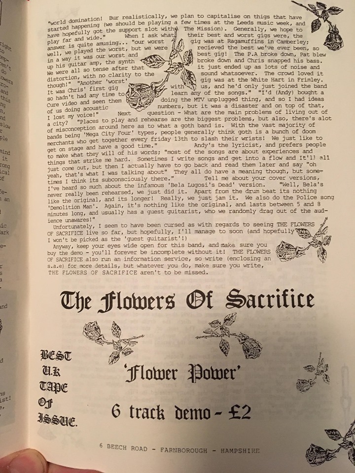 Somewhere there is a video titled “The Carnival of Darkness” and a third cassette titled “Succubus”. Towards the end of the band’s life, they played a gig at The Moonlight Club, London and their final performance was at Ragamuffins, Camberley. In July 2015 “Shadows to Whisper” was e-released via Jindivik’s Bandcamp page, compiling The Flowers of Sacrifice’s two cassette EPs and the track published on Farnborough Groove Vol.1.