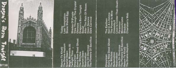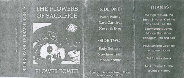 The following year the cassette EP: “Flower Power”, was released, carrying the six tracks “Word Politik”, “Dark Carnival”, “Never & Ever”, “Body Betrayal”, “Nowhere Train”, and “Monochrome”. ’92 also saw The Flowers of Sacrifice’s “Dark Carnival”‘ and “Monochrome” appear on the German goth rock compilation cassette ‘Dragon’s Born Tonight’ [BT 38] on the Beton Tapes label and “Asylum” included on Farnborough Groove Vol.2, of which The Gossville Arsonist was not overly complimentary. This was either side of Barney Rubbles at Lakeside Cabaret Club, Frimley on 17 April ’92, where The Flowers of Sacrifice appeared with Peachrazor, Giant Arc, Nuss, and Girls on Dextrose. Halloween, 31 October ’92, was spent at the Halloween Goth Spectacular at The George, Ash Vale, where the Flowers… were joined by Girls on Dextrose and Different Drummer.