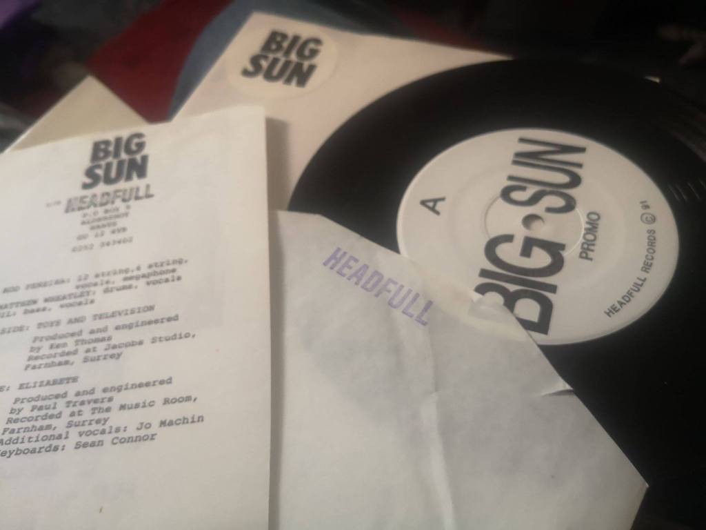 During ’91 Big Sun released a promo 7″ single [BS 1] on Headfull Records called “Welcome to The Realm of Doctor POP (Pt. 1)” carrying “Toys and Television“, and “Elizabeth“ on the B-side; recorded at Jacob’s Studio, with Ken Thomas producing and engineering and The Music Room, Churt with Paul Travers producing and engineering.