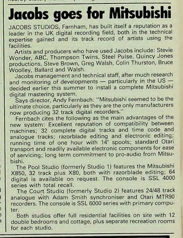 In mid ’85 the studio upgraded to 32-track equipment, installing a Mitsubishi X850, 32-track plus X80, both with razorblade and electronic editing, and an SSL 4000 Series console with total recall in The Pool Studio (formerly Studio 1). Studio 2, which was renamed The Court Studio, featured 23/48 analogue with Adam Smith synchronizer and Otari MTR 90 recorders, and the SSL 6000 console with primary computer.