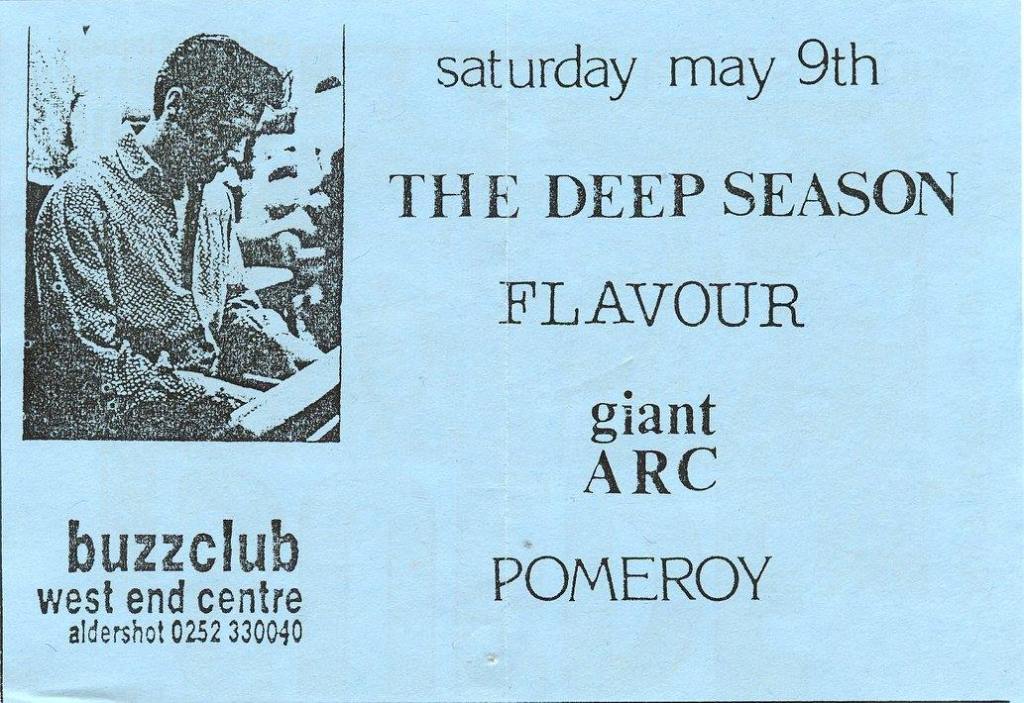 Out of the ashes of Jim Jiminee came Fleet’s The Deep Season. Their first known gig was at The Buzz Club, West End Centre, Aldershot – while After the Dream supported Explodehead, along with The Screaming Benders, This Witness, and Cow played the main hall; The Deep Season played the bar area. Ten days later, on 16 April, Deep Season headlined Buzz Club with After the Dream and This Witness in support.