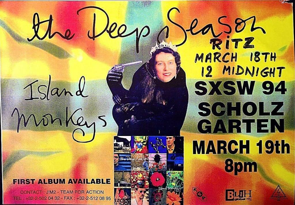 The Buzz Club had the band headlining once again on 9 May ’92 for a local band night, supported by Giant Arc, Flavour and Pomeroy. Interest from Columbia resulted in ’93’s “Island Monkeys” LP and the “Evergreen” EP [COL 660 751-2] in ’94, which was re-released in 2017. Columbia’s promotion work got “Lovesome Day” from the LP some radio play on Belgium Delta Radio/Bilzen 5 and “Evergreen” on Radio LAC/Geneva S and on S Couleur 3/Lausanne G in Switzerland. The band also visited Austin, Texas, for South by South West (SXSW), in ’94 playing at the Ritz and Scholz Garten.