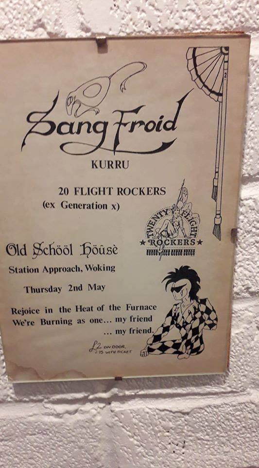 Karl Moult replaced Luscombe on bass. Ex-Screaming Lullabies George took a stab at relaunching the Kavern Club for a third time at The Old Schoolhouse, Woking on 2 May ’85; along with KURRU, and 20 Flight Rockers – although it was originally billed that Who Pays the Ferryman would play -, Sang Froid were on the bill.