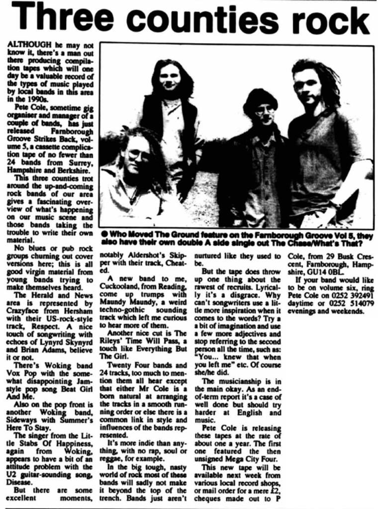 They played venues locally and up into London, such as The Bull & Gate, Kentish Town with Who Moved the Ground? on 15 September ’93 and The Old Trout, Windsor, also in ’93. The band were featured on Farnborough Groove Strikes Back, Vol.5 with “Disease” in Sept ’94.
