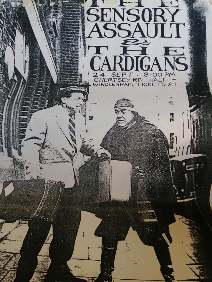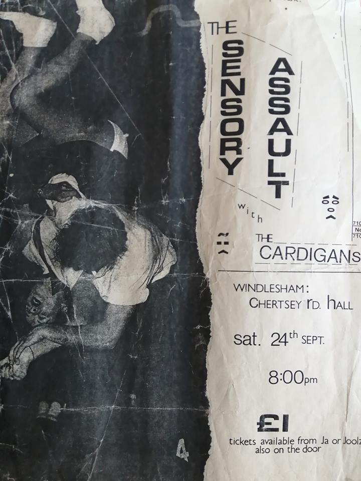 On 1 July ’88, The Sensory Assault, Eat My Shorts, and Sugar Mountain played Lightwater Country Club; one of the posters for which featured a photo montage of Eat My Shorts guitarist Adrian Barry’s (later of The Ha Ha Men) family. The band joined The Cesspit Rebels and Flexible Inconvenience on 10 September ’88 at the Village Hall, Windlesham. Ten days later, on 24 September ’88, the band appeared with The Cardigans – not the Swedish band of “My Favourite Game” and “Lovefool” fame, they came later – at The Chertsey Road Hall, Windlesham on 24 September ’88.