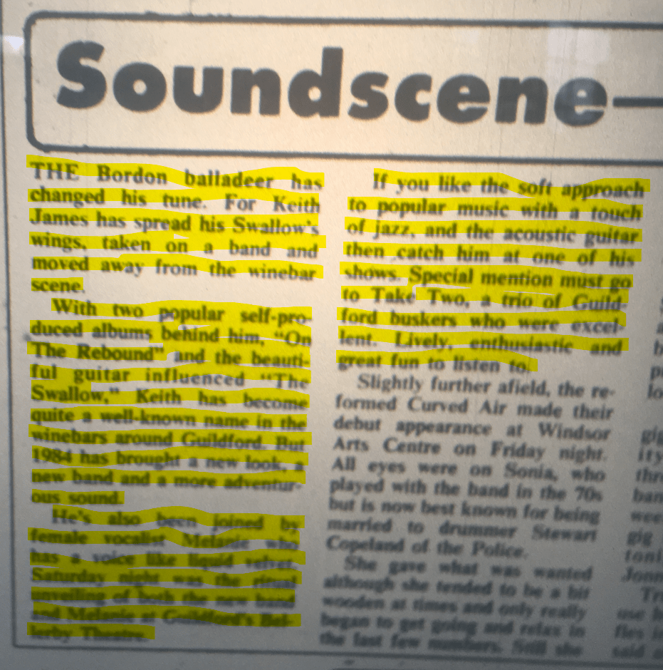 Bordon based Keith Berry built a solid solo career playing his folky popular ballads in the wine bars of Surrey and Hampshire in the late ’70s under the stage name Keith James. In ’78 he collaborated with French composer and conductor Andre Kerr, releasing four tracks as a 7″ EP on AKJ [AKJOOSI] titled “I Need You Babe”. While best known as a soloist, he would also perform backed by a band and on the 14 and 15 January ’80, Keith James was in concert with his band at the Bellerby Theatre, Guildford.