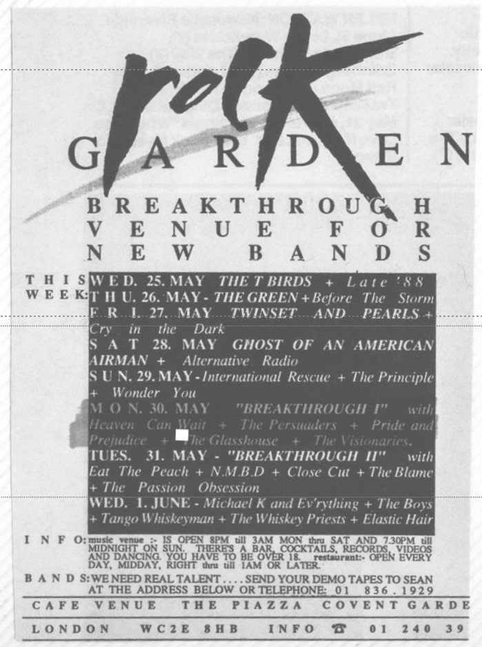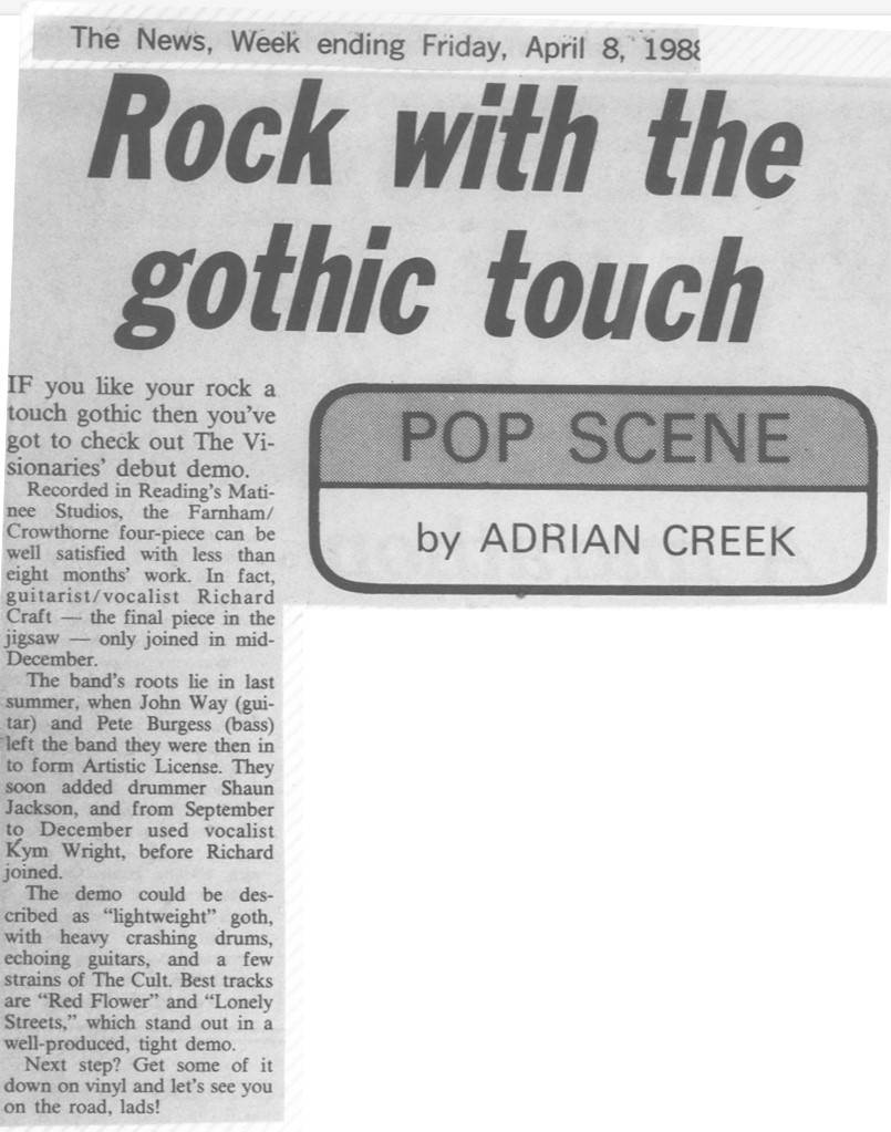 Wright was replaced by Richard Craft on vocals and guitar in mid-December ’87. The Visionaries released a demo, which was recorded at Matinee Studios, Reading, in the first quarter of ’88. This included the tracks “Red Flower” and “Lonely Streets”. On 14 April ’88 the band played at the Technical College, Farnborough; and at the end of the following month, on 30 May ’88, The Visionaries played at The Rock Garden, Covent Garden at one of the venue’s ‘Breakthrough’ nights, along with Heaven Can Wait, The Persuaders, Pride and Prejudice, and The Glasshouse.