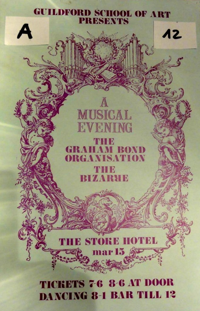 Sometime in ’66, the Whisker Davies Blues Stormers, who regularly support for The Stormsville Shakers, secured regular support slots at the Stoke Hotel’s Sunday night dances for the likes of Jimmy James and the Vagabonds, Nashville Teens, and Alexis Korner. The renowned Ricky Tick Club, Guildford, after being pushed out of The Plaza by bingo, moved in Feb ’66 to The Harvest Moon, Guildford for a couple of months, before ending up at The Stoke for four months, until their last Guildford event in October ‘66. The Guildford School of Art presented “A Musical Evening with The Graham Bond Organisation and The Bizarre” on 15 March ’66. On 14 July ’66 John Mayall’s Bluesbreakers played The Stoke. After the 25 June that year Eric Clapton failed to show at several gigs as his time with the Bluesbreakers drew to a close – this was not one of them. David Gale recalls, in Guildford Past and Present, standing in the bar listening to John Mayall and hearing an additional blues guitar playing, which turned out to be Clapton joining in.