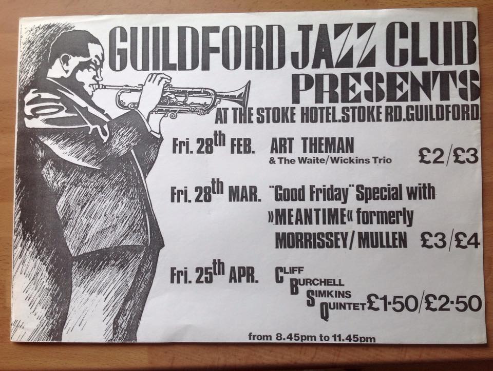 On 9 March ’80 local band Noit Otni and The Pits played a lunchtime gig at The Stoke Hotel; and the next month, on 3 April, Raised on Robbery were in the function room. A little later in the decade, Colin Tipton ran the Guildford Jazz Club out of The Stoke from ’82-’87, before moving to the bar at the Civic Hall, Guildford. The Jazz clubs house band consisted of Iain Ballamy, Geoff Simkins, Adrian Kendon, and Dave Wickens (drums), and we know they played on 14, 24 and 28 October ’84. The club hosted Clark Tracey’s CT3+ on 24 April ’85 and the next year welcomed Art Theman with The Waite/Wickens Trio on 28 February ’86. The following month Meantime, who were previously known as Morrissey/Mullen, appeared on 28 March, followed by the Cliff Burchell Simkins Quintet on 25 April. The 80’s also saw Something Will Happen, The Sid James Experience and The Ant Hill Mob play there.
