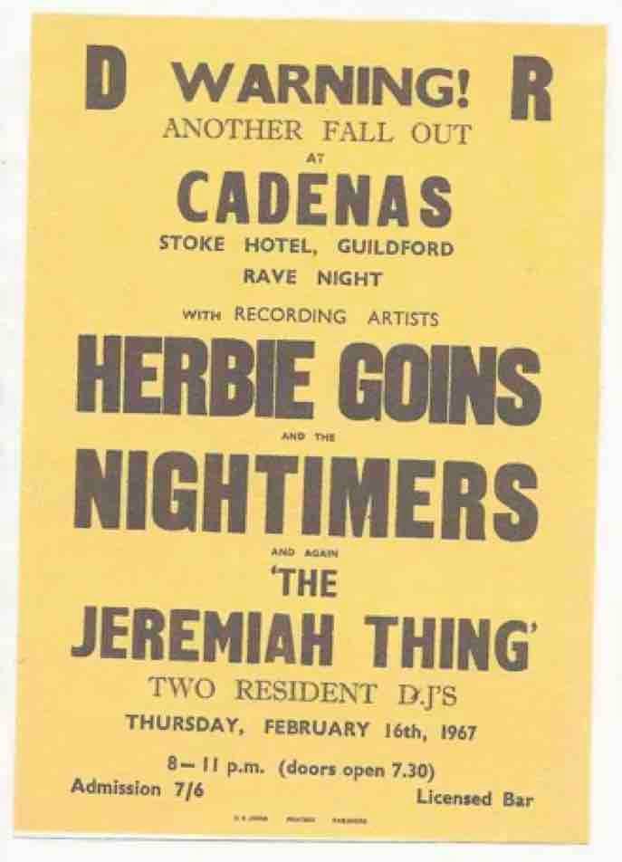 After Ricky Tick came Cadenas, run by Doug ? and Robin ?, on Thursday nights. On 16 February ’67, Cadenas hosted Herbie Goins and the Nightimers, supported by The Jeremiah Thing. Cadenas struggled, but before folding in March ’67 it hosted Pink Floyd on 2 February ’67 to a rather lack-luster audience. On the 16 February The Jeremiah Thing appear to have headlined and one of the club’s last nights, on 9 March ’67, saw The Jeremiah Thing once again in support, this time for The Shevelles. On 26 May ’67, Tony Knight’s Chessmen were supported by The Other Two Thousand. Later in ’67, the Whisker Davies Blues Stormers played with Tony Rivers and the Castaways at The Stoke. Circus, the renamed Stromsville Shakers, had two gigs at the venue as part of their heavy scheduled in late ’67, visiting on 28 October and 23 December.