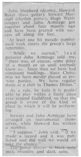What we know: (c’65) John Shepherd (drums), Howard Baker (bass), Stewart Marshall (guitar), John Armitage (guitar), and Hugh Webb (vocals). Played mostly private parties, had regular dates at a club in Thames Ditton, and tried to play fairly close to Guildford. The band wore black polo-neck sweaters and dark suits.