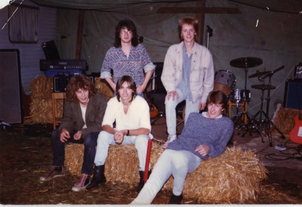 (c’83-’85) Gideon Goddard (?), Alan “Gobber” Godfrey (keyboards), Richard Greenough (?), Danny Cundy (guitar), and Barry Noakes (?)