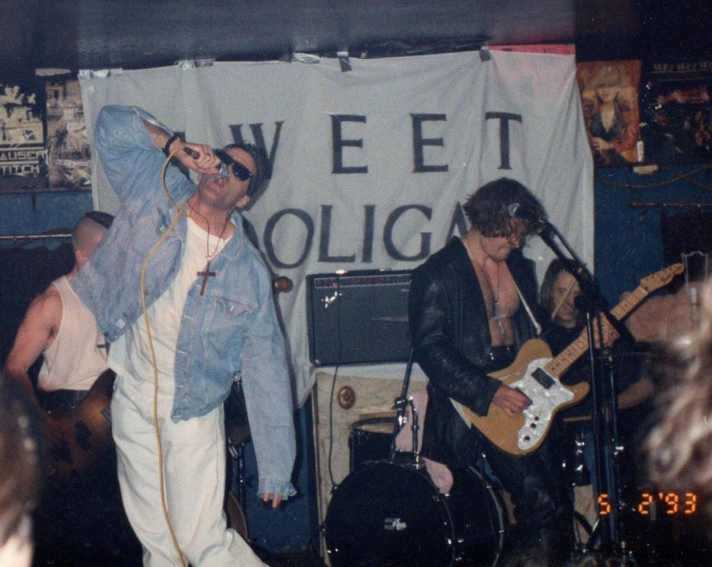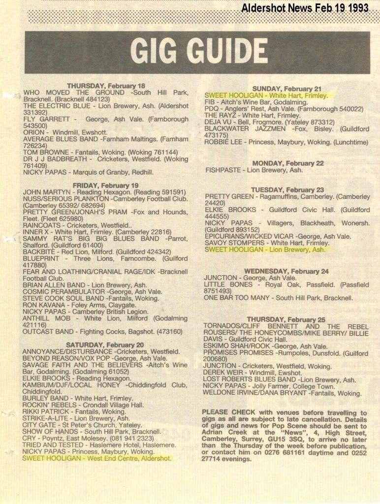 The George, Ash Vale hosted the Hooligans on 5 February ’93, who dropped a rowdy set of the pub’s punters. They followed this with a gig at the Technical College, Farnborough on 11 February. Later in the month they appeared, on 20 February ’93, at the Critical Club event at the West End Centre, Aldershot with Fly Garrit and Girls on Dextrose. The next night they were at The White Hart, Frimley on 21 February ’93, and two days after that Sweet Hooligan played The Lion Brewery, Ash on 23 February. October ’93 saw them share the Premier’s Nightclub, Basingstoke stage with Mind’s Eye and Chunderhive. A Kerrang editor was there on the night, labelling the band ‘under-rehearsed…’, which was kind of the punking point.