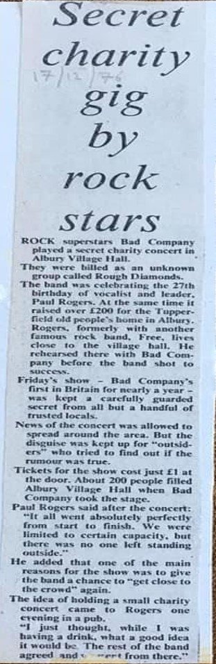 In December ’76, Bad Company returned to the Village Hall to perform a ‘secret’ charity gig for Paul Rodgers 27th birthday. Billed as the Rough Diamonds. The band charge a quid a ticket and raised just over £200 for the Albury based Tupperfield old people’s home.