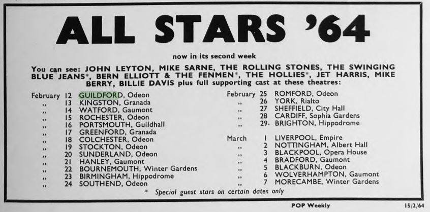 One of those package tours, the All Stars ’64 tour, headlined by John Leyton, along with Mike Sarne, The Swinging Blue Jeans, The Rolling Stones, Don Spencer, Billy Boyle, Mike Berry and The Innocents, and Jet Harris, bought Billie Davis and the Le Roys close to her hometown when it hit the Odeon, Guildford on 12 February ’64. She returned to BBC Radio 1’s Saturday Club on 13 June ’64 (Episode 298).