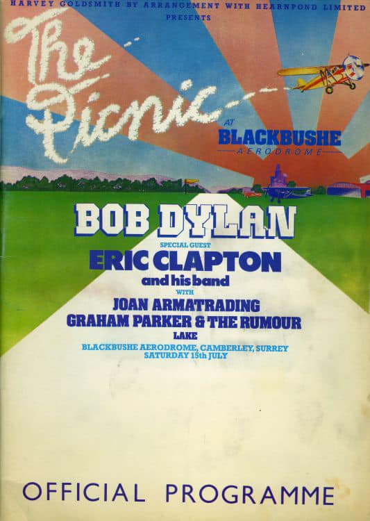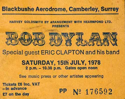 Bob Dylan headlined, with Eric Clapton, Joan Armatrading, Graham Parker & The Rumour, Lake, and Merger also on the bill. This was Dylan’s last European appearance in ’78, and first UK date in 9 years, and Armatrading was flying in from the US just for this concert. The gates opened at noon, with the concert running from approximately 2pm to 10:30 that night. If you were at the back, with all those other punters in front of you, there wasn’t a great deal to see. During the event a few thousand ‘card parachutes’ were dropped from a helicopter over the audience promoting Dylan’s “Street Legal”.