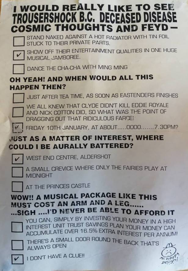 West End Centre, Aldershot: Trousershock B.C., w/ Deceased Disease, Cosmic Thoughts, and FEYD
