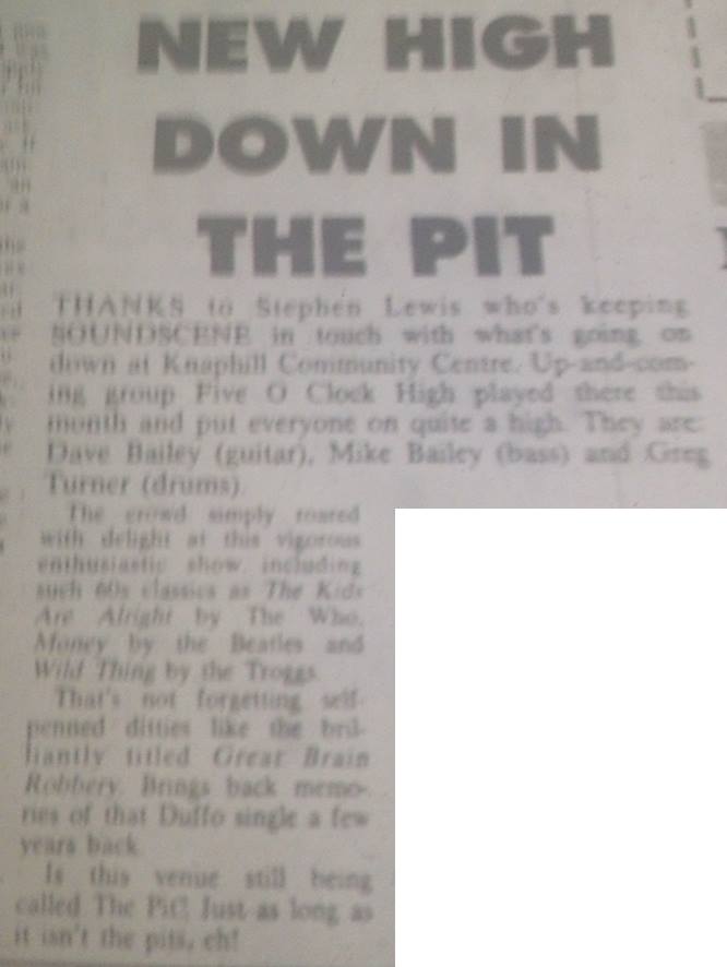 Glib Thicket were at the Community Centre, supporting Backstage Pass, on 23 March ’84, and the very next week, on 30 March, were back there again for a solo gig. Later in the year, on 28 July, The Pit hosted Carnival. By ’85, Carnival would be renamed Five O’Clock High and under this moniker they appeared at the venue regularly.