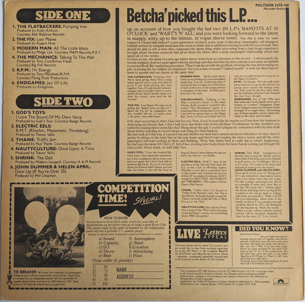 Fitch was also in The Wasp Factory and The Desotos, along with Huthert, Trew, and Longden. The latter would go to be join The Desotos, after which they rebranded as Virgin Daze; and was involved with Kudos, Bite the Bullet, and Fear of Flying with Thane. Trew, in addition to The Desotos, had been in The Torpedoes, The Vulgar Bros., and White as White (and Twice as Dirty). Thane, who went on to provide the vocals and songwriting for Last Chance to Dance, Out Of Order, and Fear of Flying with Longden, regrettably passed away in 2020.