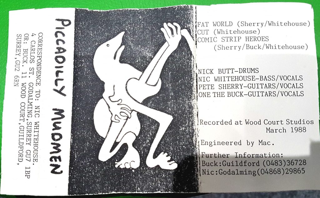 This Guildford/Godalming band played The White Lyon, Worplesdon and The Duke of Wellington, Farncombe quite a few times – they actually rehearsed in a cellar over the road from the Duke. They also gigged extensively in Guildford, Godalming, Ash, Gomshall, Woking, and up into London. They recorded an eponymous demo cassette EP at Wood Court Studios in March ’88, that carried “Fat World”, “Cut”, and “Comic Strip Heroes”.