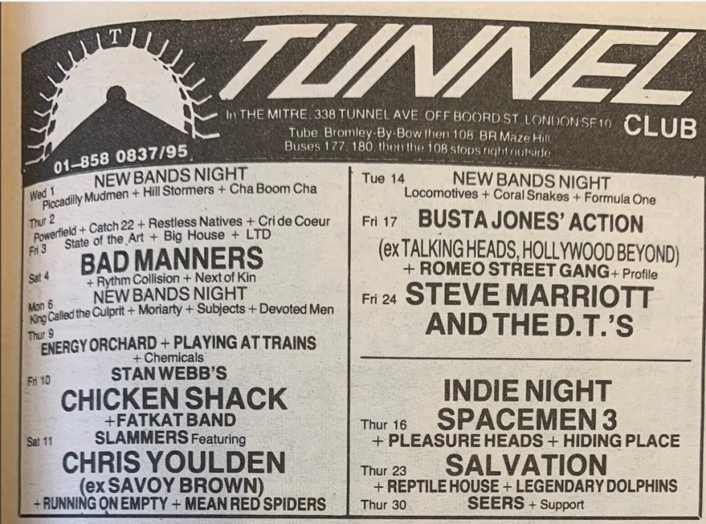 The 2 April ’88 found them, supported by His Wooden Fish, at The Red Lion, Milford and two months later, on 1 June ’88, the band were booked, along with Hill Stormers and Cha Boom Cha, for the new band night at The Tunnel Club at The Mitre, London.