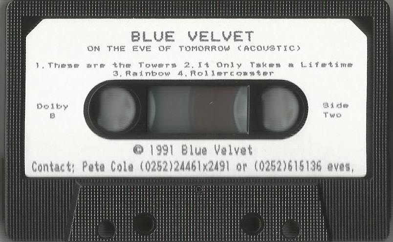 Blue Velvet were joined by Jim O’Neil on keyboards for the recording of the eight tracks of “On the Eve of Tomorrow”, with its electric and acoustic sides, in November / December ’91; after which Island Records offered encouragement but no contract. Frantic also used the studio to lay down the “Blue” demo cassette, with its hand painted sleeve.