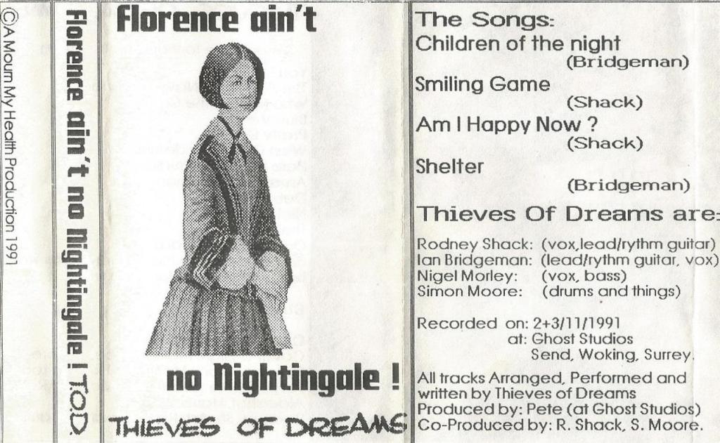 More locally orientated; in 1990 Who Moved the Ground?‘s “Good Night Danny” was recorded and mixed with Pete Mills at Ghost. That same year, The Sack released a six-track demo cassette titled “Oh, No!”; which had been recorded and mixed at Ghost over three days in July. In November ’91 Thieves of Dreams released the 4-track demo cassette “Florence Ain’t No Nightingale!”. This was also recorded at Ghost Studios, and carried “Children of the Night”, “Smiling Game”, “Am I Happy Now?”, and “Shelter”. TOD recorded a further two demos at Ghost, including “We Were in Love”.