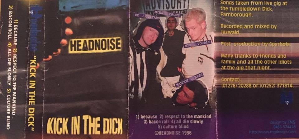 In ’96 the band released the “Kick in the Dick” cassette EP, which was recorded live at the Tumbledown Dick, Farnborough. Disturbing Guests supported them that night, enjoying the massive PA Headnoise had hired for that show. Issue #3 of Gerfump!, which came out in April ’96, carried a review of the J.C. Regulator, Headnoise, and Sandwich Box gig at the West End Centre on 22 March.