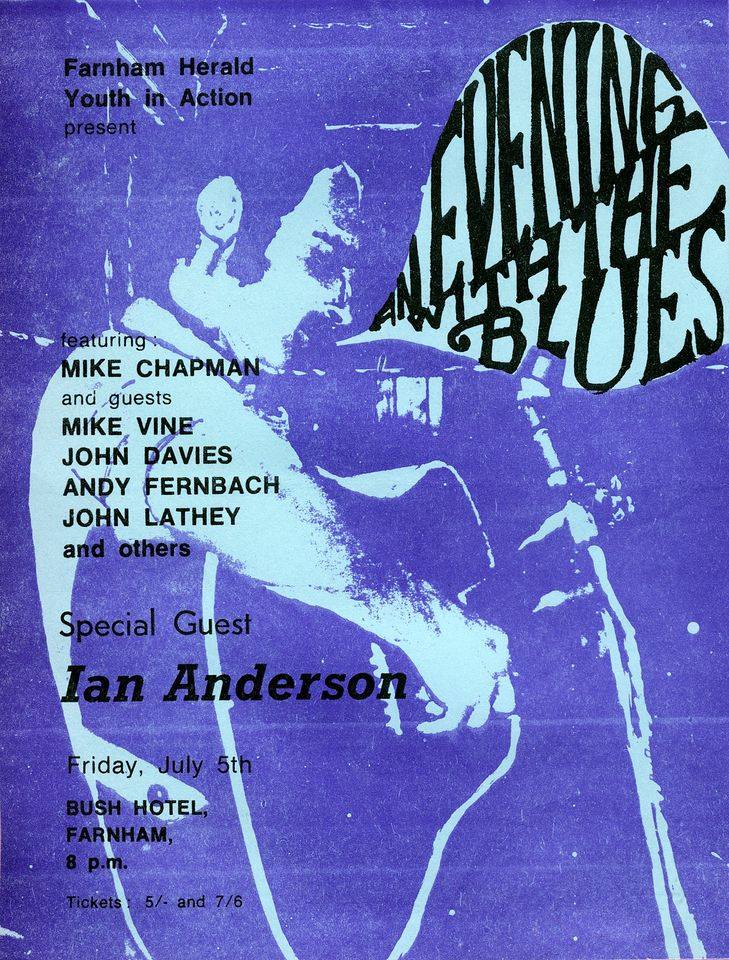 The Bush was a more active participant in Farnham life back then and hosted events like the Farnham Herald’s Youth in Action “An Evening with the Blues”, partly organised by Jerry Gilbert, who worked on the Herald and eventually moved on to Melody Maker, on 5 July ’68. This featured Mike Chapman, Mike Vines, John Davies, Andy Fernbach, John Lathey and Ian A. Anderson.