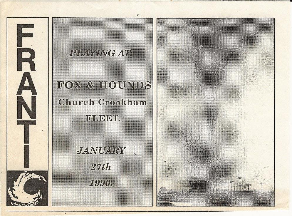 Sometime in ’85, This Breed of Heroes had their debut gig at the pub. Then on 23 January ’86, The Fox & Hounds opened their doors to the friends, family and fans of West One. Christ! began their annual pilgrimage to The Fox & Hounds in ’89, which ran for three years to ’91. On 4 November ’89, Who Moved the Ground? played (and recorded – see below) their debut gig there, as did Parmaviolet a few months later on 30 May ’90; but not before a well-received Frantic played the venue on 27 January, Country Hazard appeared on 16 April, and Who Moved the Ground? had returned to give the punters a second dose on 28 April ’90.