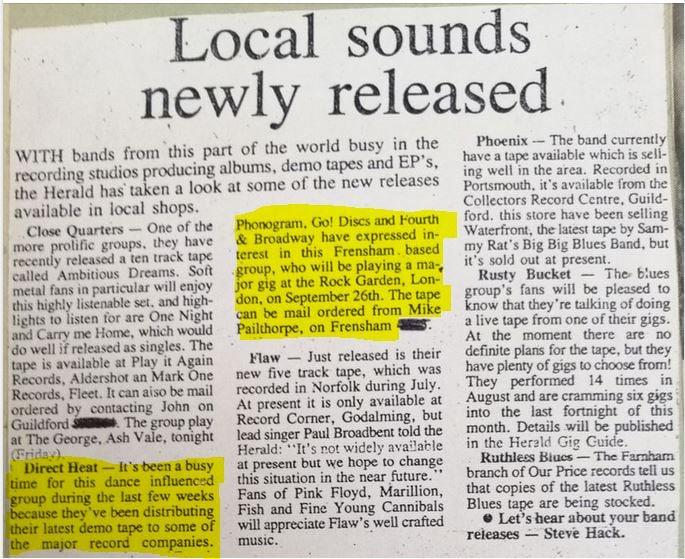Frensham based dance influenced Direct Heat were touting a demo around the labels in mid-late ’90 with reported interest from Phonogram, Go! Disc, and Fourth & Broadway. They played the Rock Garden, London on 26 September ’90.