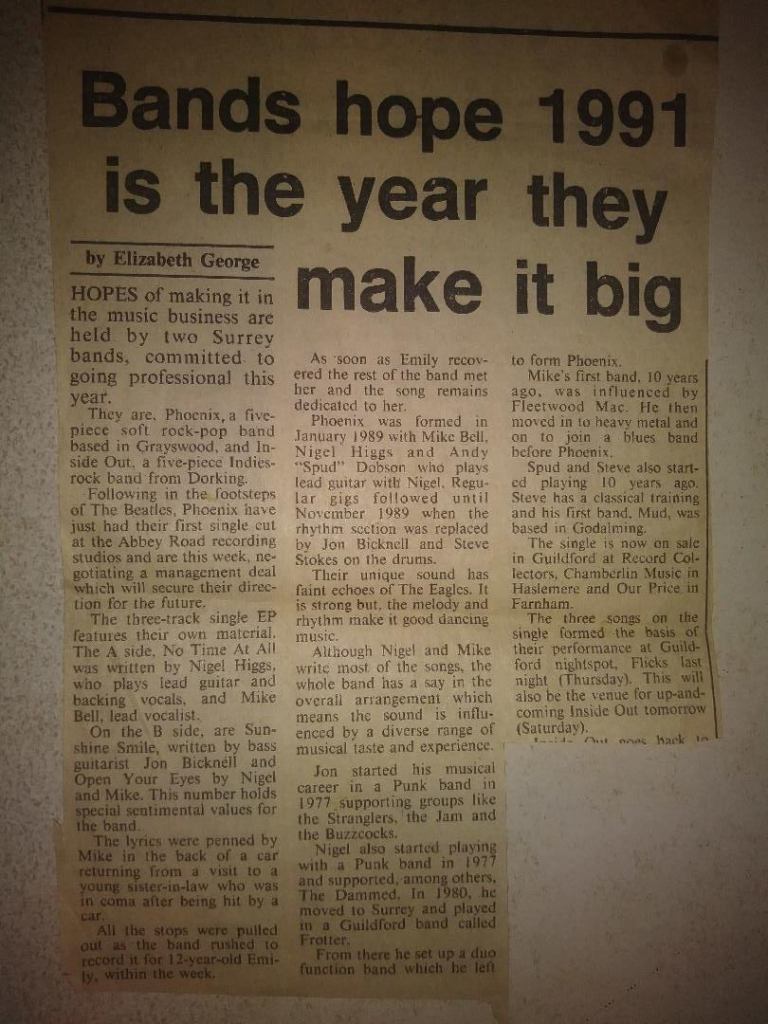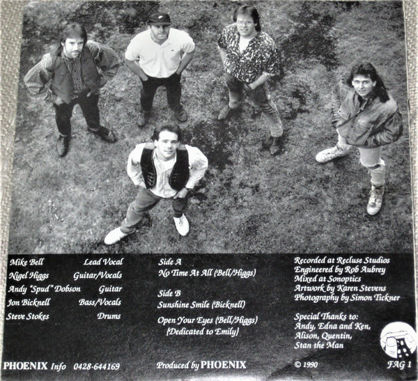 In 1990 the band released a vinyl EP titled ‘No Time at All‘ [FAG1] on their own Roll Your Own Records label, pressing a limited 1,000 copies, which were sold through Record Collectors; Chamberlin Music, Haslemere; and Our Price, Farnham. Cut at Abbey Road recording studios it did receive some airtime on local radio. The title track was recorded using studio time they had won in Southsea Pier’s ‘Battle of the Bands’ that same year. The B-side carried ‘Sunshine Smile’ and ‘Open Your Eyes’; the latter being penned and dedicated to Emily, Bell’s sister-in-law, who was in a coma after being hit by a car. The band are known to have played the Astolat, Guildford; Cartoon, Croydon; and Flicks, Guildford.