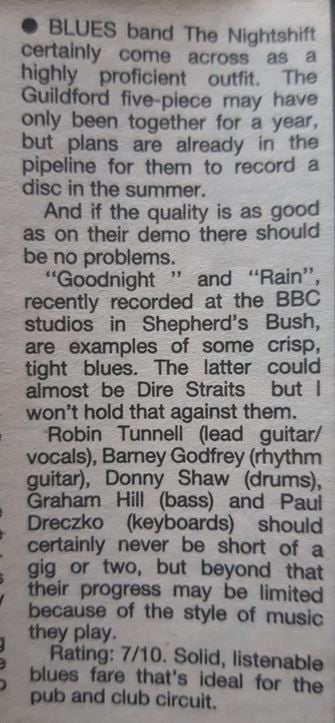 Dreczko, who’d previously replaced Philip Joseph on keyboards in La Maison du Chants, would later audition to join Sweetlife, but didn’t; and had been in Kamaleon before Nightshift. Hill was first spotted in The Vulgar Bros c’79. Renowned for his pink kit, Spinks was also in a showband called Abacus and did some session work with Womb.