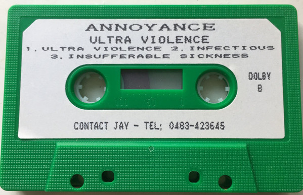 This Godalming based death metal band released a demo cassette in ’91 and followed it with the self-released 3-track cassette EP, ‘Ultra Violence‘ in ’93. This was recorded at Studio 9, Brixton and engineered by LIV, across the 20 and 21 March ’93, and carried the title track, ‘Infectious‘ and ‘Insufferable Sickness‘ on both sides. The only complete name we have associated with the band to date is the listed EP’s cover artist, Becci Wood.