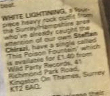 On 1 November ’84, Sweeny Todd headlined at the Ad Lib Club, held at The Kensington, Russell Gardens, with White Lightning in support. Later in the month this NWOBHM band self-released a small run of the 7″ single This Poison Fountain / Hypocrite – composed by Pengilly with lyrics by Jones – on their Wild Party Record [PP 1000] label, based in Staines. Shortly after which, in late ’84, White Lightning appeared at The Royal, Guildford receiving a positive review from Steffan Chirazi, published in the 9 December issue of Sounds.