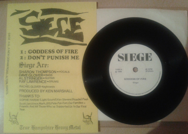 The Royal hosted the band, as headliners again, on 27 February ’85. That same year saw the self-released “Goddess of Fire” [THM1], a 7″ single on the band’s ‘True Hampshire Metal Records’ label, the B-side of which carried “Don’t Punish Me” from the original demo. This was mastered at Utopia Studios and produced by Ken Marshall. Guesting on keyboards for the single was Rachel Glover; and while the information sheet/sleeve originally listed Conquer, he was replaced on bass by Dave Glover on this recording. In fact, only Thompson remained from the original line-up as Al Stringer had replaced Black on guitar earlier in the year.