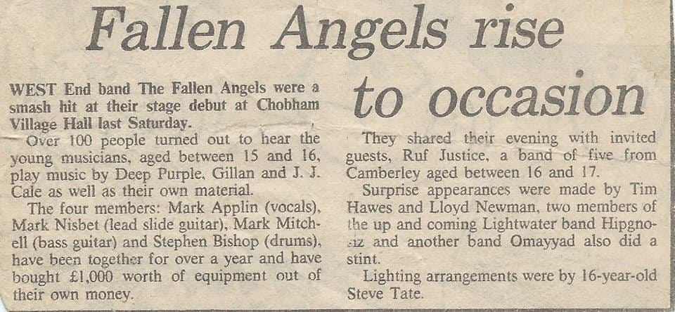 Heavy rock focused, The Fallen Angels was the first band for these 15- to 16-year-old rockers from West End. They covered the likes of Deep Purple, Gillian and J.J. Cale as well as playing their own material. The band played the Village Hall, Chobham on 10 January 1981, supported by Omayyad and Camberley’s Ruf Justice, with Tim Hawes and Lloyd Newman of Hipgnosiz making a surprise appearance.