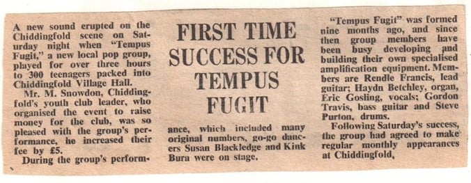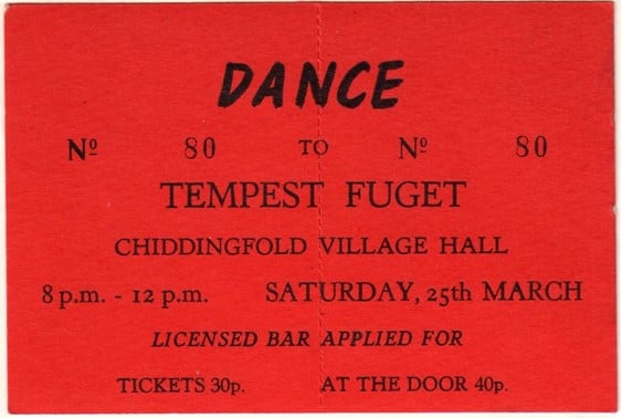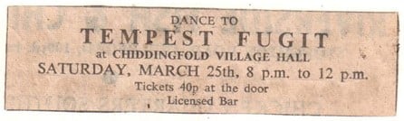 On 25 March ’72 the band, mistakenly listed as Tempest Fuget on tickets and accompanied at times by dancers Susan Blackledge and Kink Bura, played for three hours at the Village Hall, Chiddingfold to a crowd approximately 300 teenagers. This performance secured the band a monthly booking at the Chiddingfold hall. They were certainly there on 1 July ’72 as part of the Chiddingfold Carnival.