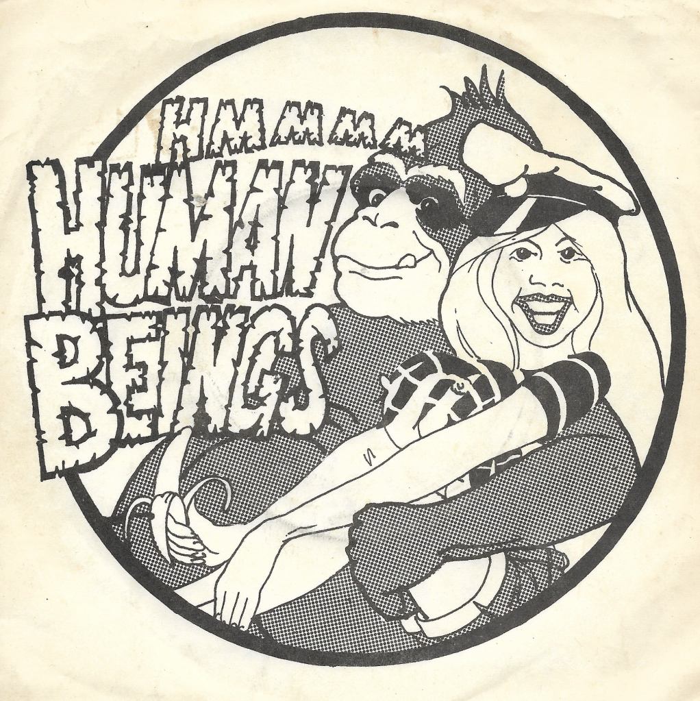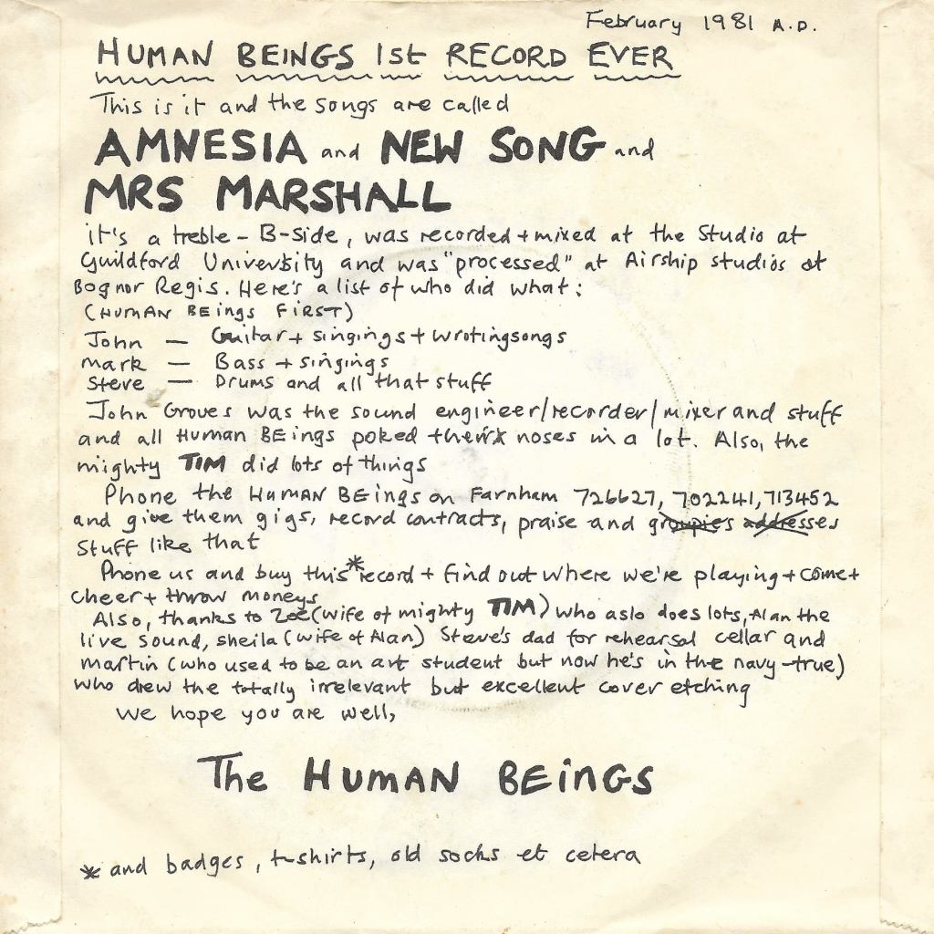 Formed in mid-’77, Human Beings began life as a punk band, migrating into ‘soft rock’ as they rehearsed in the cellar of a house in Farnham. They played all over West Surrey, East Hampshire and into Sussex (The Grange Centre, Midhurst) and supported T. T. Transmission at the Town Hall, Farnham, The Vapors in Guildford – who were reportedly not amused by the meaning behind “Hit Pick” – and The Suspects at The Wooden Bridge, Guildford.