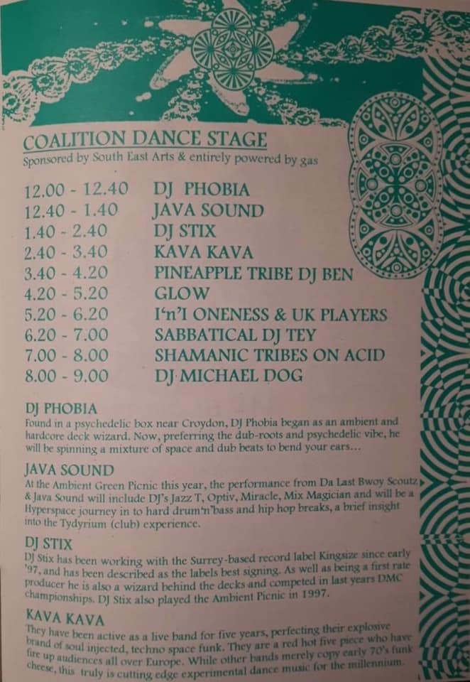We can neither confirm nor deny if Pineapple Tribe were involved in an all-night rave in August ’97 at the chalk pits off White Down Lane. After keeping local villagers awake with “some sort of demonic festival”, it was broken up when police served the organisers a notice under the Criminal Justice and Public Order Act at 8:30am. The Crew, well Ben at least, were on The Coalition Dance Stage at Ambient Green Picnic ’98, held in Guildford, between sets by Kava Kava and Glow on the itinerary.