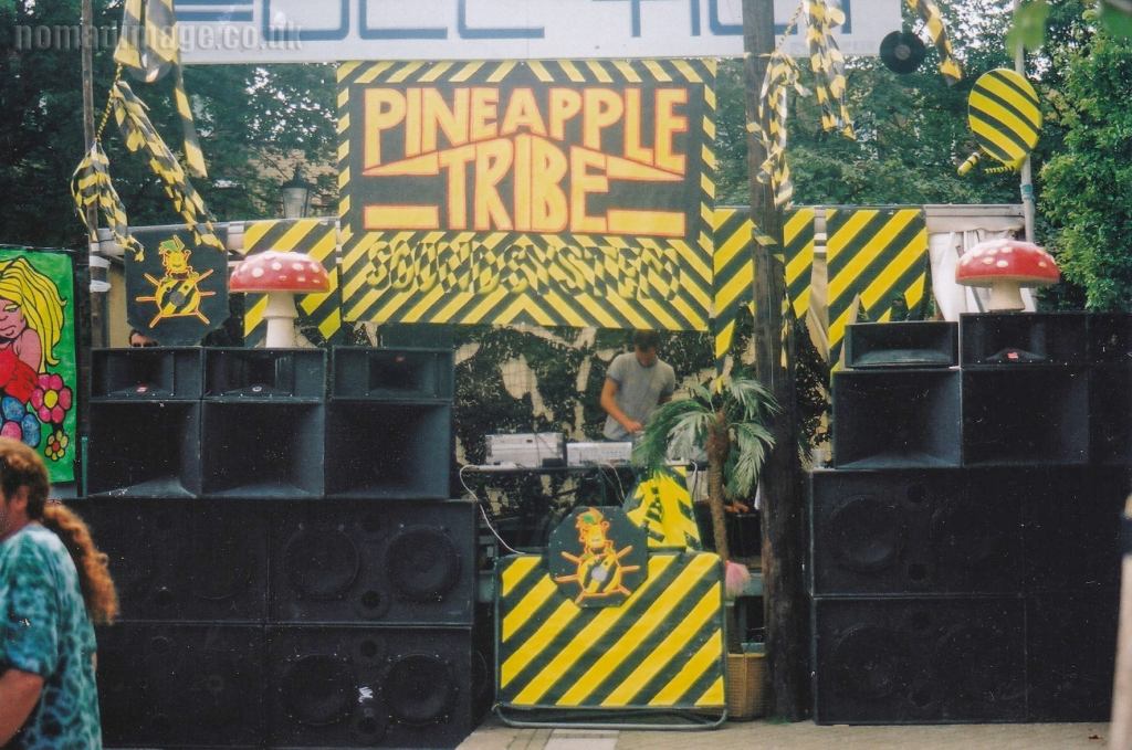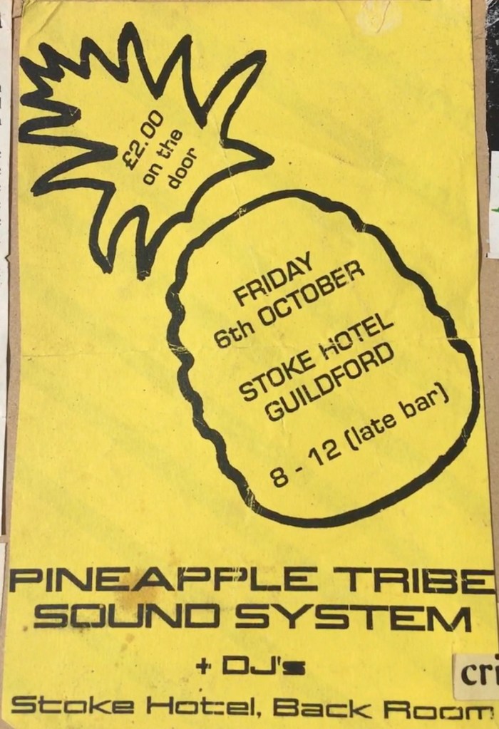Out of the free party scene of the early 90’s came the Woking / Guildford area electronic / trance crew Pineapple Tribe. The crew’s first outing was to a boarded-up property in Colgate, near Horsham, in ’94, after which they began DJ’ing at The Britannia Inn, Guildford and The Abinger Arms, Abinger, and on 6 October ’95 they also appeared at The Stoke Hotel, Guildford.