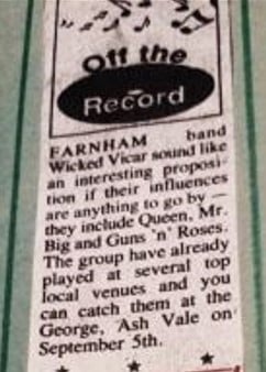This Farnham band were influenced by Queen, Mr Big and Guns ‘n’ Roses and we know they performed at The George, Ash Vale on 5 September ’92. On 26 January ’93, they were back at The George with J.C. Regulator; returning once more on 23 February ’93 to support Epicureans.