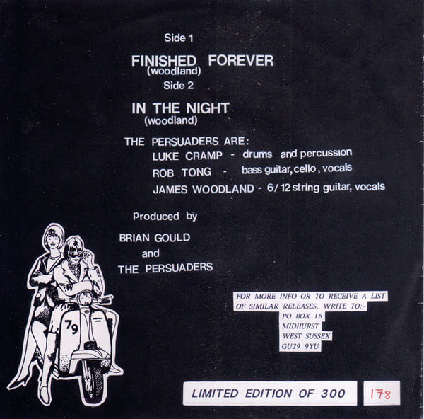 In 1992, The Persuaders, from Margate, sent Holmes a demo tape and a few months later 300 copies of Finished Forever/In the Night [DR001] were released in January ’93 – Detour Records first release. They sold well, indicating a market for mod influenced music. That same year Detour released DR002 through to 009.